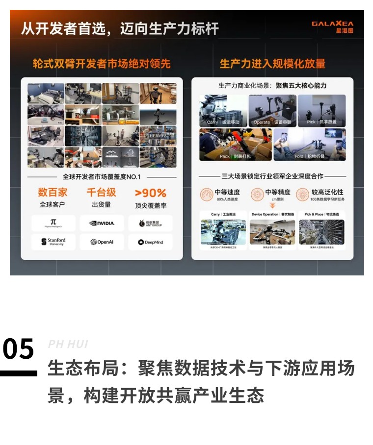 星海图以“智能定义本体”为核心,围绕轮式双臂、灵巧操作、全身运动控制三大方面持续迭代,已构建起从核心部件、整机平台到开发工具的完整产品体系,是行业内极少数能同时满足顶级科研与工业级工程需求的通用平台。作为具身智能硬件的标杆,R1 系列已通过 Physical Intelligence、斯坦福 AI 实验室、英伟达等全球顶尖开发者的检验,成为服务于全球顶尖模型的核心基座;同时也成为全球顶尖汽车主机厂和一线物流运营商的首选生产力平台。