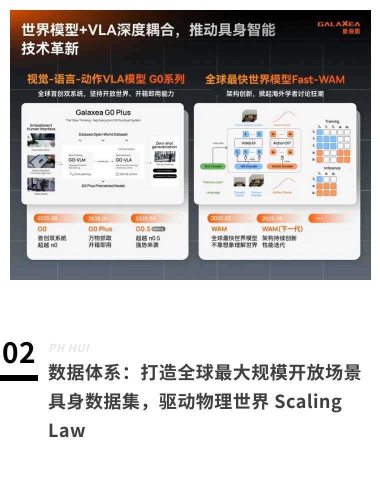 公司作为全球“快-慢双系统”VLA模型的技术开创者,持续领跑全球具身基础模型能力。2025年8月开源G0 VLA大模型突破当时SOTA;2026年1月开源全球首个开箱即用VLA模型G0 Plus;2026年2月开源面向衣物折叠的垂类场景G0 VLA模型、支持端侧轻量化部署的G0 Tiny小模型,持续夯实具身智能规模化应用的技术储备。即将发布的G0.5模型将再次更新全球SOTA纪录并开源,让机器人的基础模型具备真正的通用落地能力。