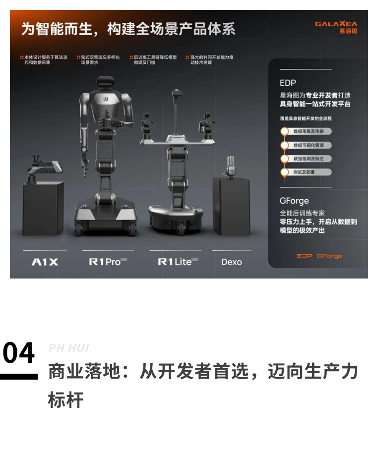 硬件之外,星海图自研的EDP具身智能开发平台实现了真实场景下从数据采集、标注到模型部署的全流程闭环。通过集成一站式后训练工具,EDP 与具身基础模型、机器人本体深度协同,大幅降低了研发门槛,为开发者提供了一条从原型验证到规模化部署的高效路径。