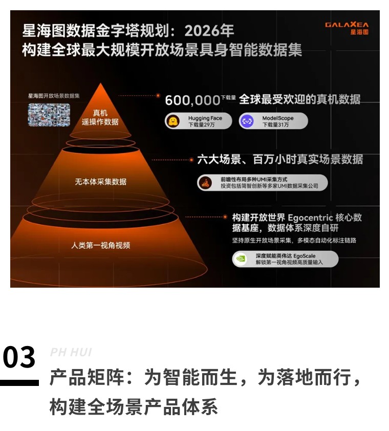 星海图坚持构建真实场景具身数据引擎,公司开源的全球首个开放场景具身智能真机数据集 (GOD) ,重新定义高质量真机数据标准,发布一个月即登顶全球下载量首位,被开源社区广泛认可为2025年全球最高质量具身真机数据集,全球下载量已突破60万次。