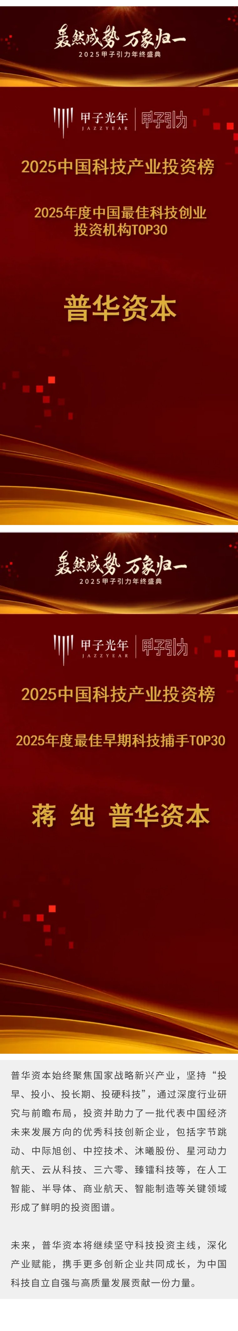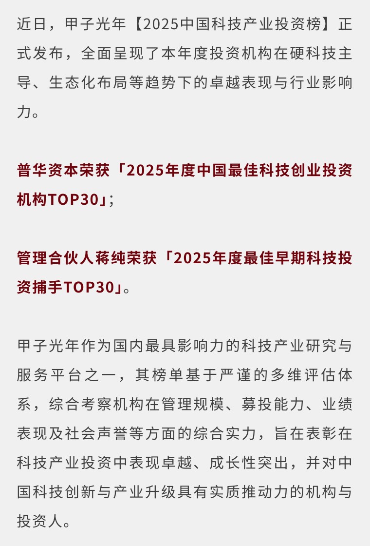 普华资本荣获甲子光年「2025中国科技产业投资榜」多项大奖| 普华荣誉
