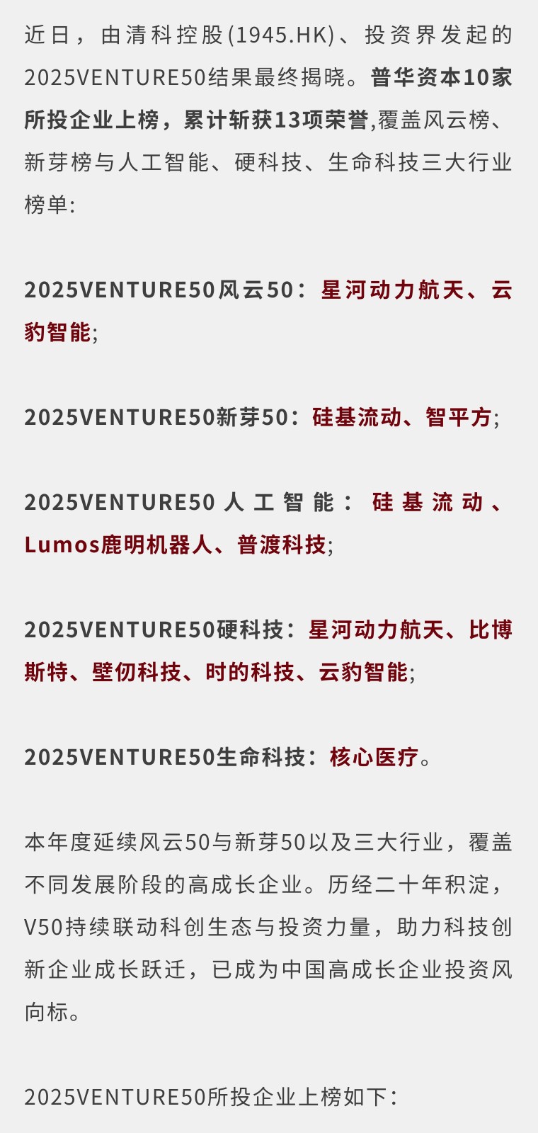 13项荣誉,普华资本10家已投企业上榜清科「2025VENTURE50」| 普华荣誉