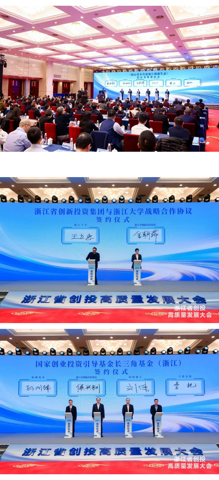 省委常委、常务副省长徐文光主持大会,省市领导张雁云、胡伟、尹学群、姚高员、汤飞帆和全国社保基金理事会副理事长赵军、中国证券投资基金业协会党委书记施真强出席。会上,省创新投资集团、杭州市分别作推介发言,省创新投资集团与浙江大学签署战略合作协议,国家创业投资引导基金长三角基金(浙江)现场签约。普华资本、君联资本、蓝箭航天、千寻智能作交流发言。现场还发布了《耐心资本共建浙江创新生态》倡议书。